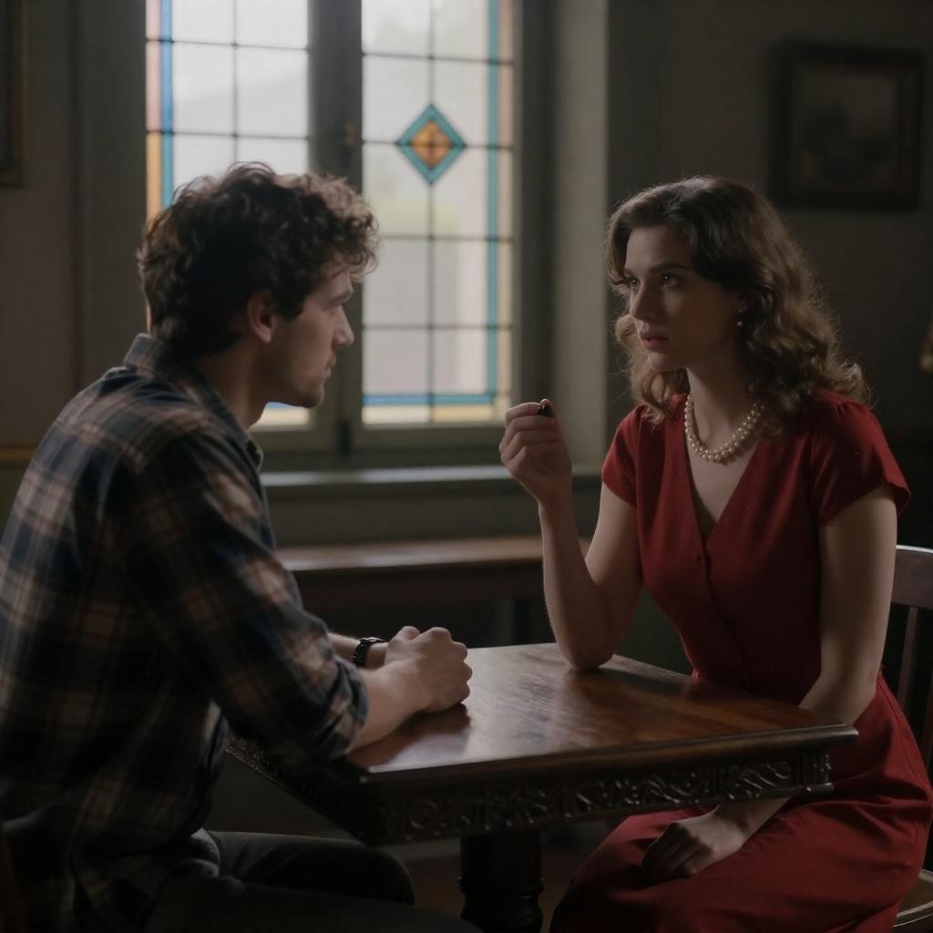 Tense scene featuring a curly-haired man in a plaid shirt leaning over a seated woman with long brown hair, wearing a blue scarf and dark coat. The woman is tied to a wooden chair with rope around her torso. The setting is a dimly lit industrial room with metal shelves and large windows, emphasizing urgency and confrontation.
