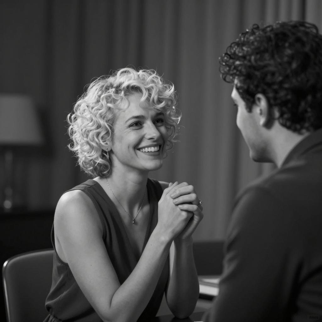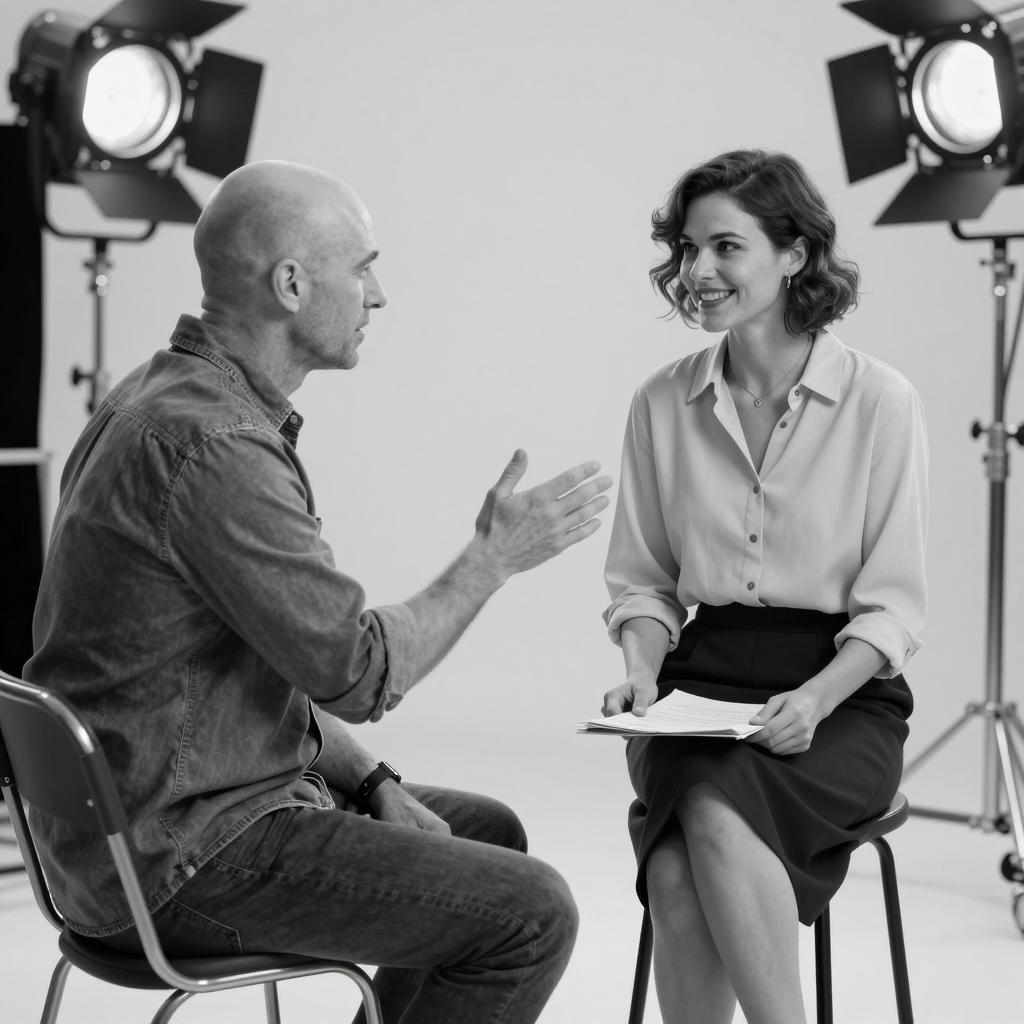 Black and white photograph of a film set. Bald man in denim shirt and pants sits on a chair, extending hand towards a smiling woman with short, wavy hair, wearing a light-colored blouse and dark skirt, seated on a stool. Film equipment and lights surround them. Woman holds a script. Intense, focused expressions. Two people.