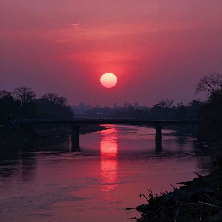 Photograph of a tranquil sunset over a calm river. The sun, a bright red orb, sits low in the sky, casting a vivid red and pink reflection on the water's surface. A silhouetted bridge spans the river, with barren trees on either side. The sky transitions from deep pink to lighter hues, with a faint outline of a city skyline in the distance. In the foreground, dark, shadowy reeds are visible on the riverbank. The overall scene exudes a peaceful, almost surreal quality, with rich, warm colors dominating the composition.