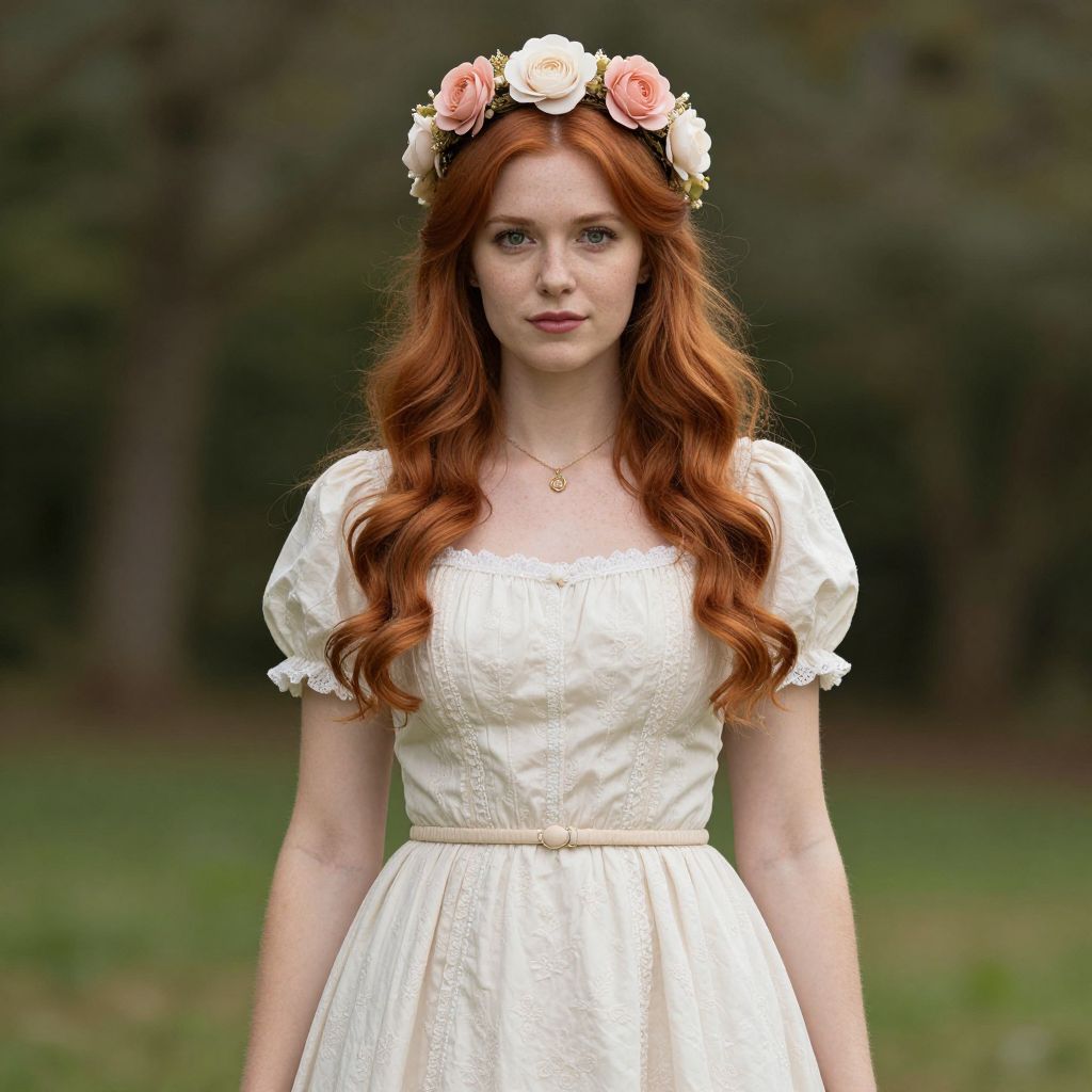 Red Hair Woman Costume, woman in a dress and a flower crown on her head
