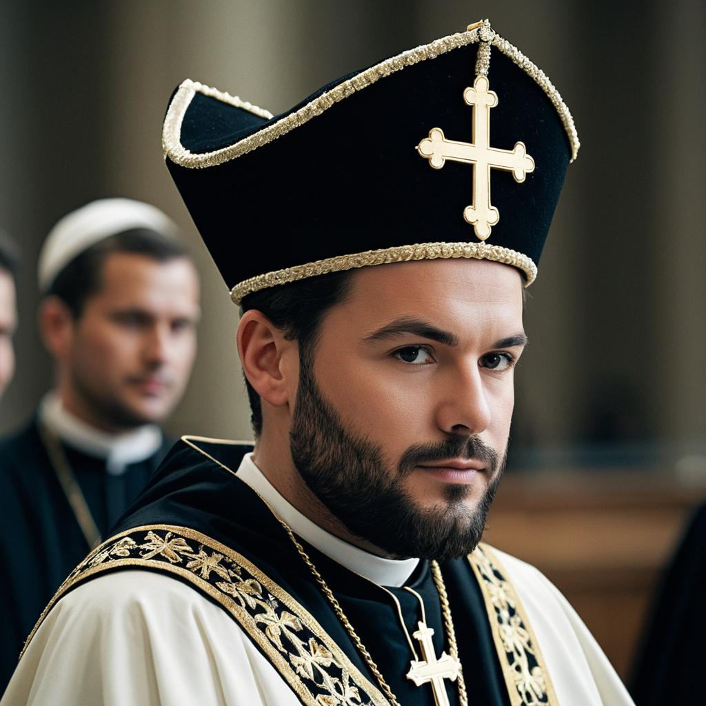 Bishop costume ,solo, 1boy, male focus, realistic, looking at viewer, priest, mitre, cross, hat, crown, facial hair, upper body, closed mouth, blurry background, blurry, robe
