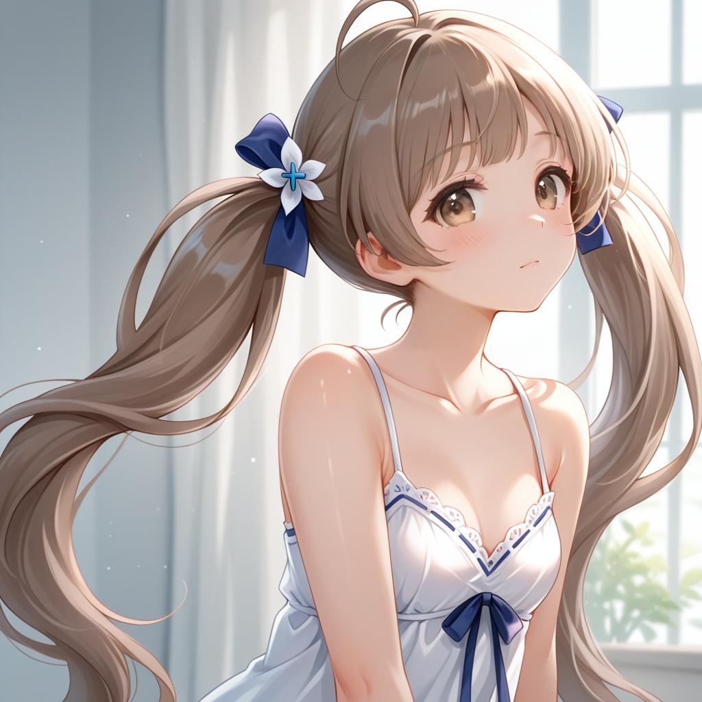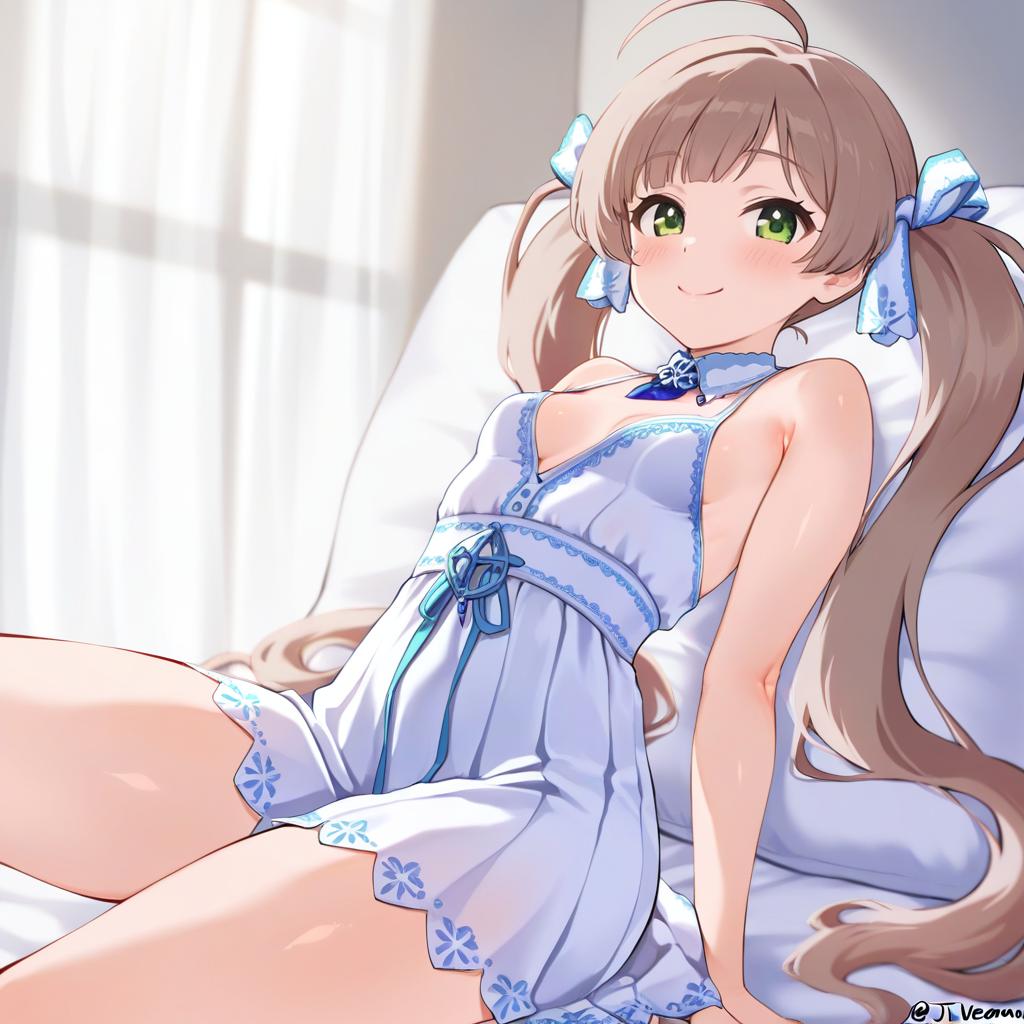 Digital anime-style illustration of a young female character with long brown twintails and brown eyes, wearing a white dress with blue accents and matching hair ribbons. She is reclining comfortably on a bed with a pillow, smiling softly with a blush on her cheeks. The background features soft natural light coming through a window with curtains.