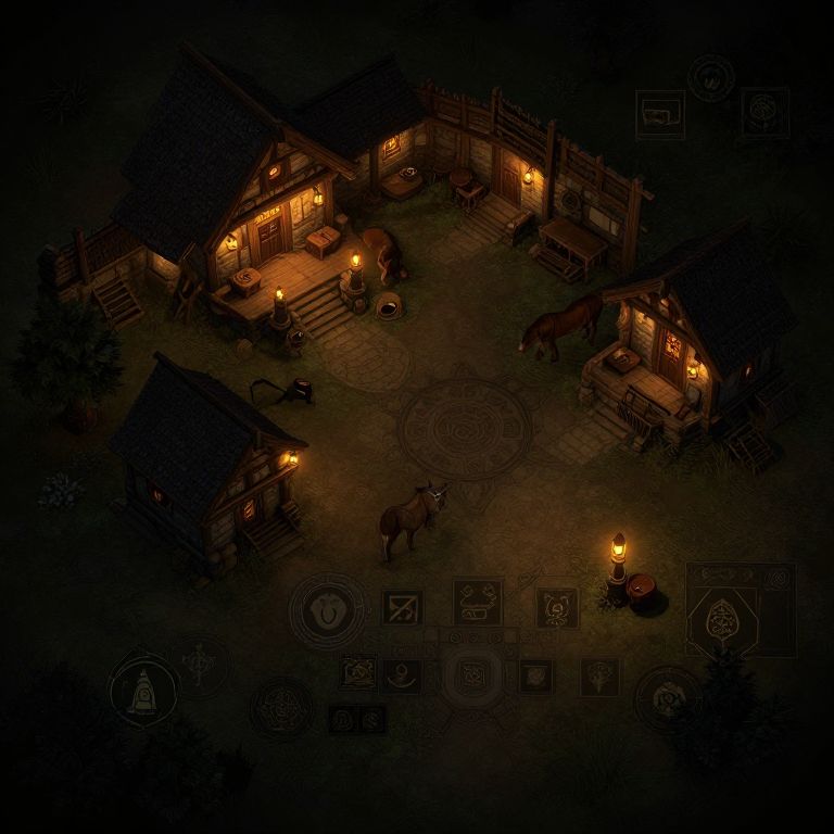 Dnd inn map, atmospheric night scene top-down map of a cozy inn with glowing lanterns outside, rustic stone and timber architecture, adjacent stables and a mysterious locked room, intricate iconography for roleplaying, immersive fantasy game setting