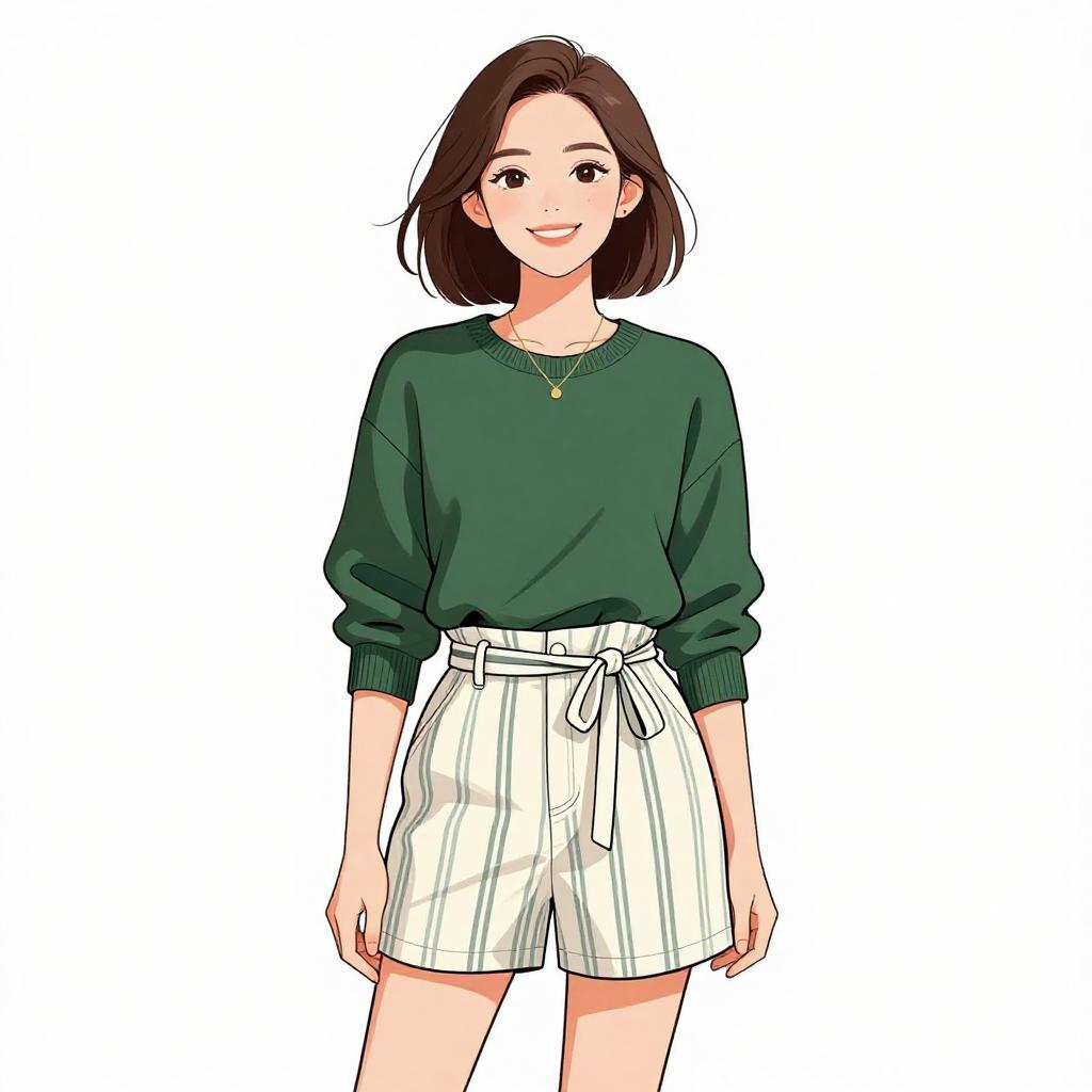 Digital anime-style drawing of a young woman with fair skin and straight, shoulder-length dark brown hair. She has a friendly smile and is dressed in a dark green, long-sleeved sweater with a subtle V-neck and a small gold necklace. She wears high-waisted, white, vertically striped shorts with a tied belt. The background is plain white, emphasizing her outfit and pose. Her expression is warm and approachable, with a slight blush on her cheeks. The style is clean and vibrant, typical of contemporary anime art.
