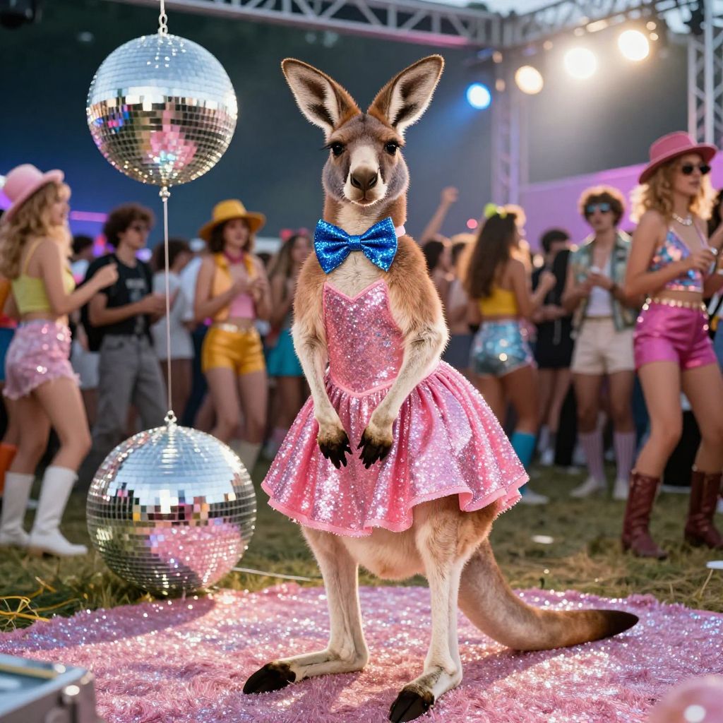 A stunning image of a kangaroo wearing a sparkly pink dress and a blue sequin bow tie at an outdoor disco-themed music festival. The scene includes a glittery shag carpet, a large disco ball, and a crowd of people in retro 70s and Y2k-inspired fashion under bright stage lights, creating an energetic and outrageous party atmosphere.