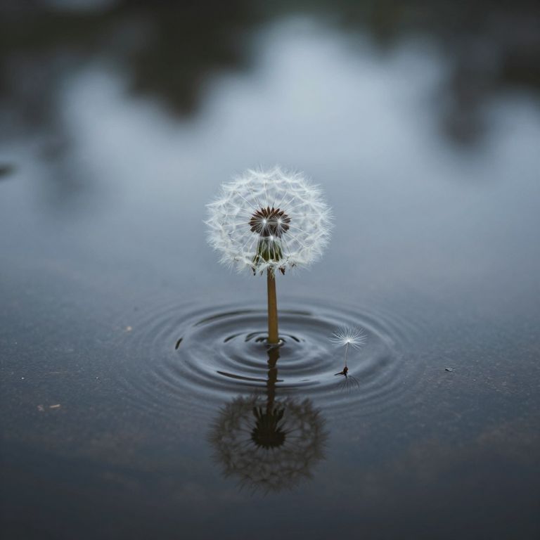 Amidst the quiet solitude of a reflective puddle, a dandelion seed stands as a fragile beacon of resilience, its delicate fluff casting ripples of hope and transience upon the surface, while the unseen depths below hint at the infinite mysteries of existence.