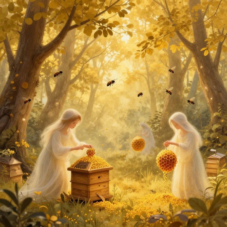 In a golden-hued forest where memory and dreams intertwine, spectral figures tend to hives brimming with pollen and honeycombs, weaving a delicate balance between the ephemeral and the eternal amidst the gentle hum of bees and the whispering leaves.