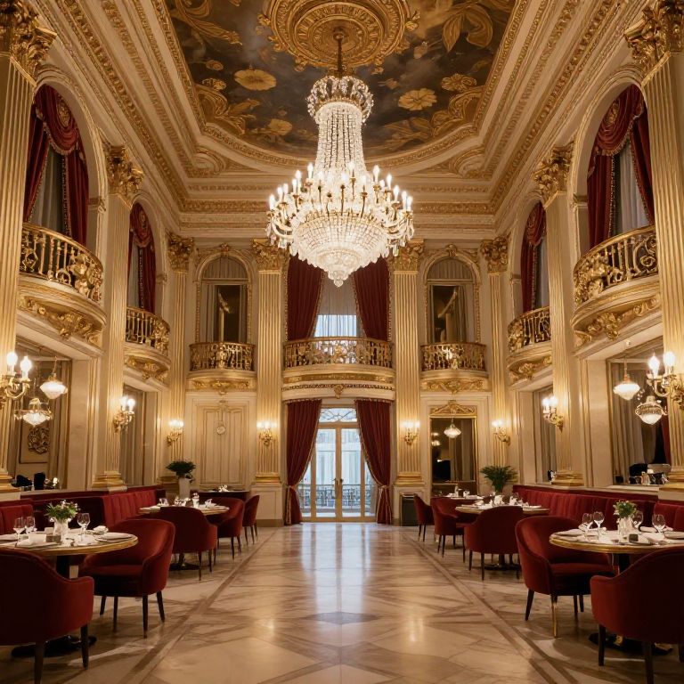 "Bristly make a 8k ultra realistic space that looks like the ball room of Grande Bretagne Hotel in Athens. make in a ladscape format. aspect ratio 16:9,"
