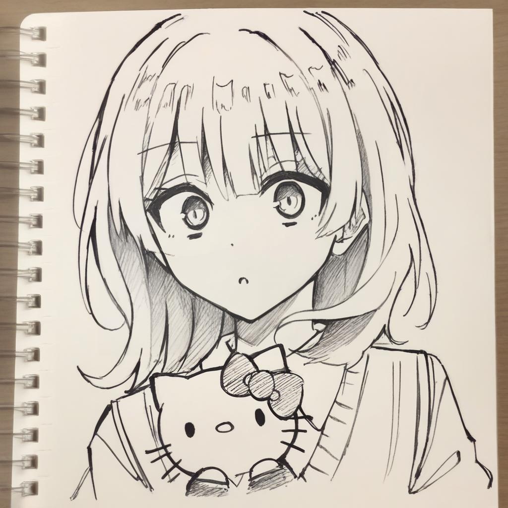 Black and white ink drawing of an anime-style girl with medium-length hair, holding a Hello Kitty plush toy. The girl has large expressive eyes and wears a sweater with a collared shirt underneath. The drawing is on a spiral-bound sketchpad.