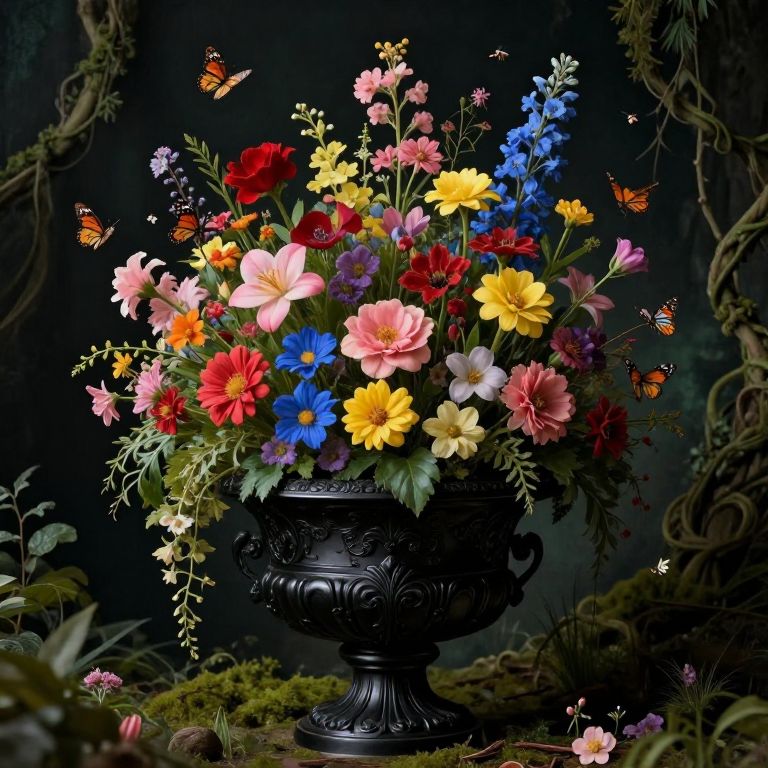 This photograph showcases a vibrant, ornate black vase filled with an abundant arrangement of colorful flowers, including pink, yellow, red, and blue dahlias, along with smaller blossoms and sprigs of greenery. Bright orange butterflies flutter around the vase, adding a dynamic element. The dark, textured background contrasts with the vivid colors of the flowers, highlighting their beauty. The vase is intricately designed with patterns and sits on a moss-covered surface, surrounded by twisted, dark green vines. The composition is rich and detailed, emphasizing the lush, natural elements and the delicate, lively interactions between the flowers and butterflies.