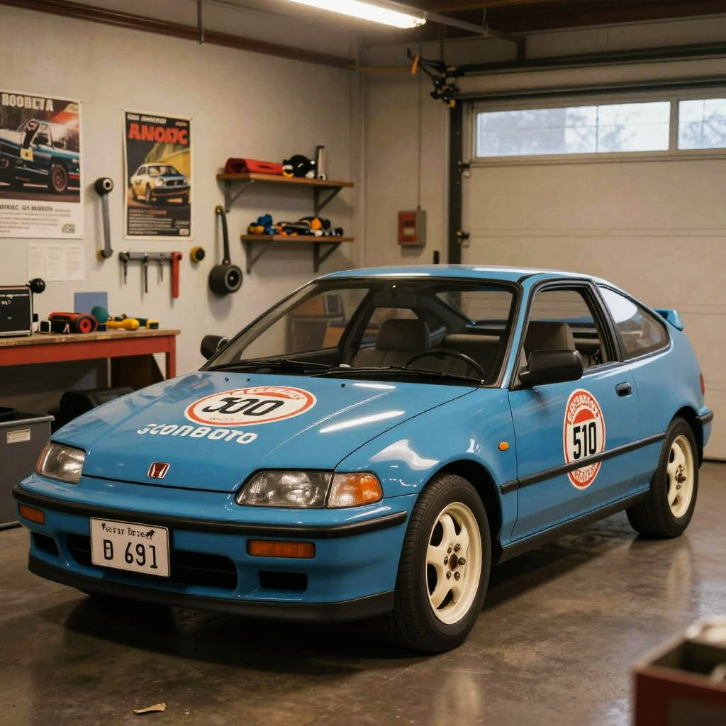Honda CRX 500 in a retro 80’s style garage, vibrant blue paint with vintage decals, surrounded by classic tools and posters, warm soft lighting creating nostalgic atmosphere, detailed interior visible through open doors, emphasizing the blend of classic and modern design elements.