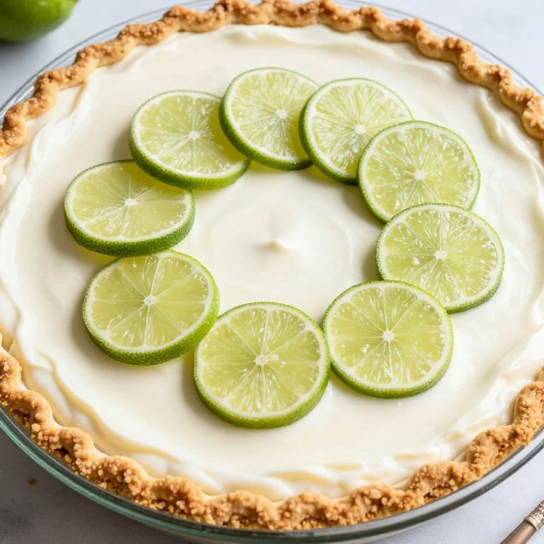 Glistening slices of lime artfully arranged in a circular pattern adorn the smooth, creamy surface of a freshly baked key lime pie, presented in a glass dish atop a graham cracker crust, ready to be served.
