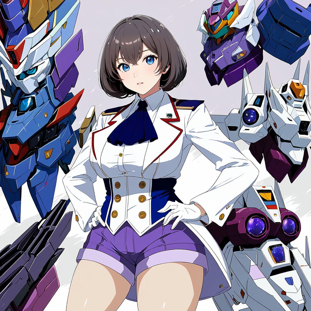 Mujina, gridman universe, 1girl, blue eyes, hair between eyes, short hair, brown hair, grey hair, large breasts, thighs, white gloves, white jacket, military jacket, purple shorts, corset, by artist redjet, animagine