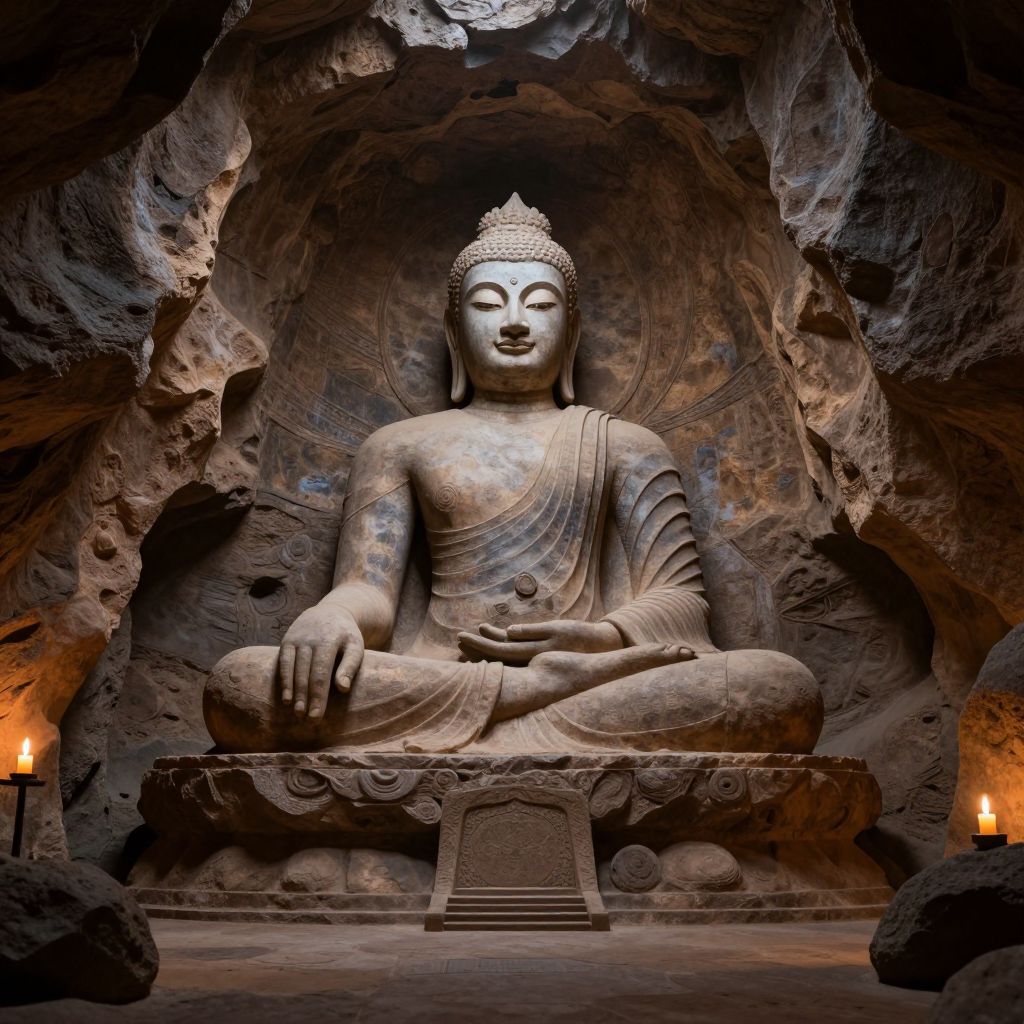 Giant! buddha!!!! statue!!, carved into a martian!!! lava cave, candlelit, cavernous interior wide shot, rough!, detailed, lava rock, elegant, concept artwork by thomas cole and tim hildebrandt
