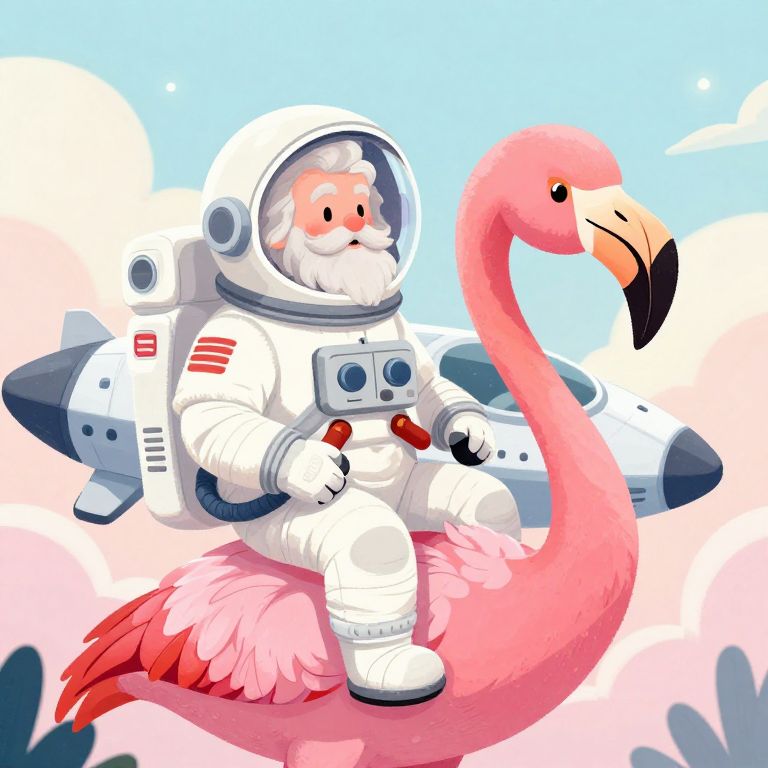 A vibrant digital illustration features a white, bearded space-suited astronaut with a small American flag on his sleeve, sitting on a pink flamingo with a long neck. The astronaut holds a red and black control stick, while a white rocket with blue accents is strapped to his back. The background is a soft gradient of blue and pink, resembling a sky with clouds. The flamingo has a bright pink body and red-tipped wings. The style is cartoonish with bold colors and smooth textures, creating a whimsical, playful scene.