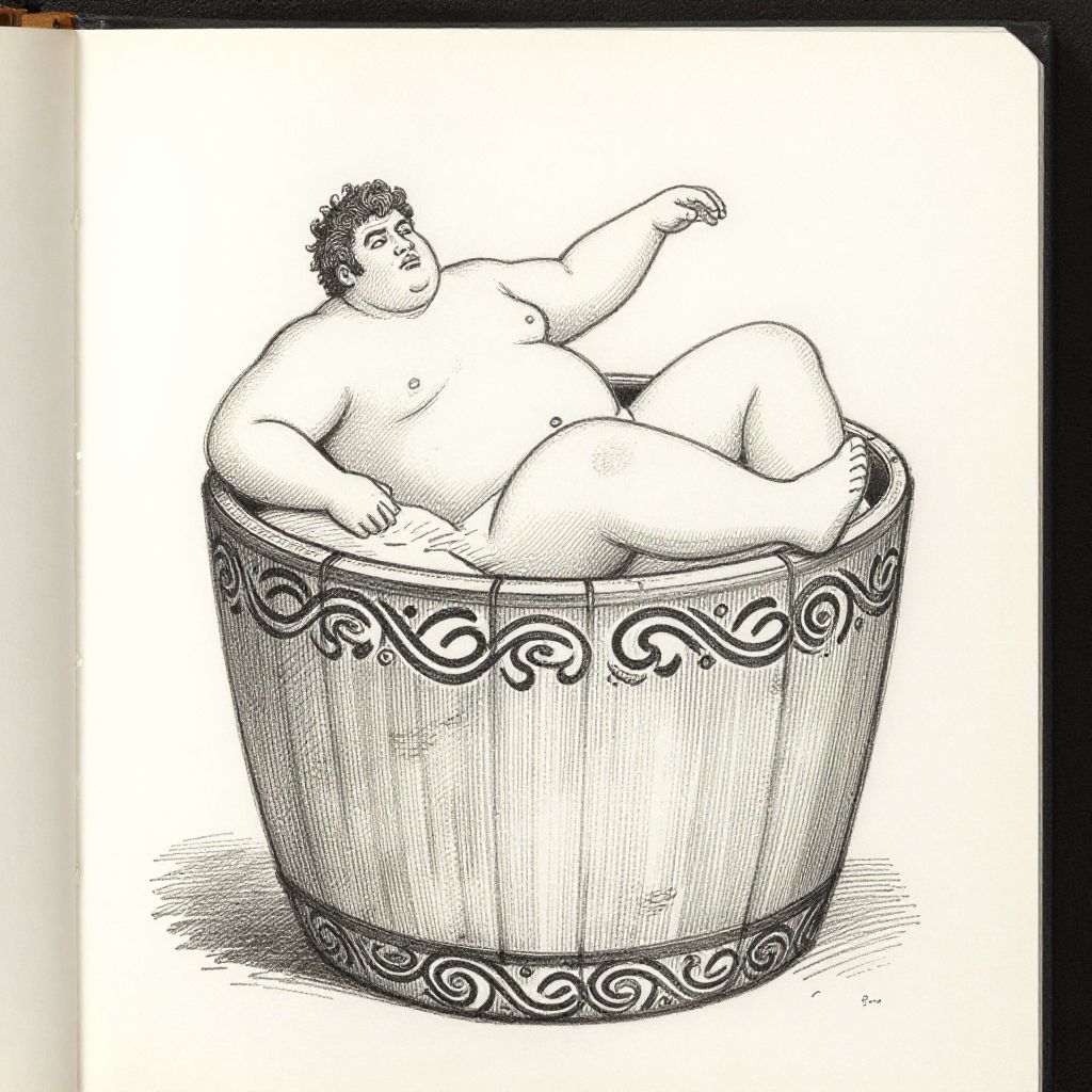 Maori scribble sketch schema , chubby man falling in a barel , victorian era style, basic marker sketch an illustrated page , lovecraft style,