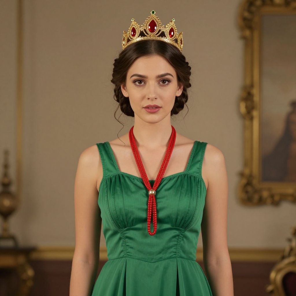 Photograph of a young woman with fair skin, dark brown hair in an updo, wearing a green dress, gold crown, and red bead necklace