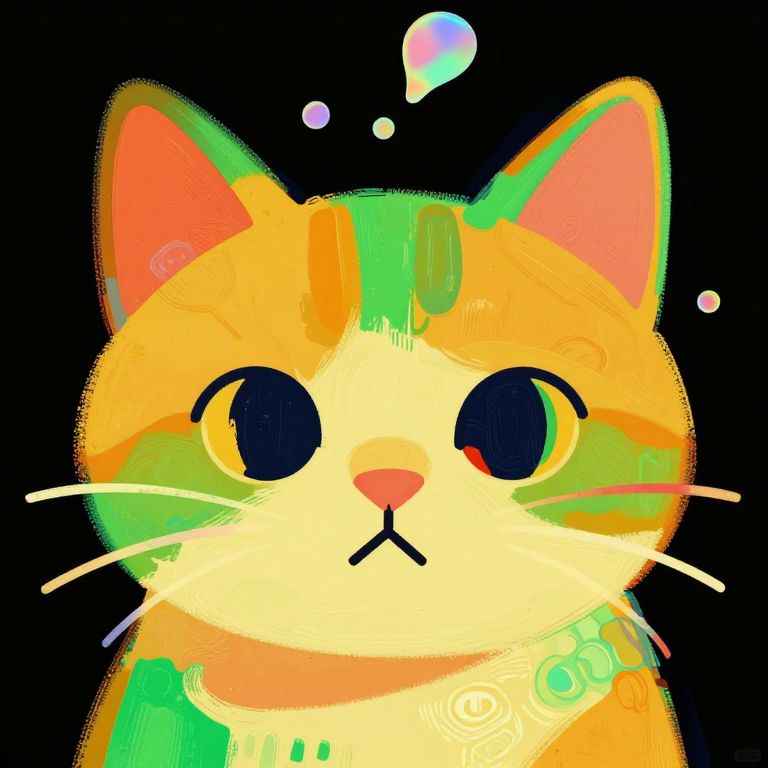 Digital illustration of a cute cat face in an abstract pop art style, featuring warm green and orange hues with holographic effects. The cat has large, rounded black eyes and minimal facial details set against a black background with colorful floating elements. Energetic brushwork and bold colors enhance the vibrant, expressive artwork.