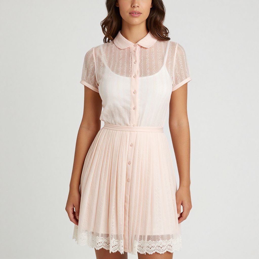"Woman, vintage-inspired, short sleeve dress in pastel pink, sheer overlay with textural stripe pattern, peter pan collar, button-up front, cinched waist, pleated skirt, knee-length with lace hem, white underdress, minimal makeup, soft curls, white background.. Sexy. Pretty face and beаutiful eyes. Big breasts."