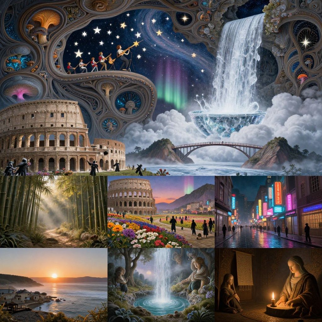 A vibrant, digitally illustrated collage features multiple fantastical scenes. The top center depicts a waterfall cascading into a luminous pool, surrounded by swirling stars and a cosmic aurora. To the left, a Roman coliseum stands amidst tall bamboo. The bottom left shows a sunset over a serene ocean. The bottom right displays a neon-lit street with colorful signs and people. The lower center highlights a serene garden with a statue and a glowing waterfall. The overall style is surreal, blending fantasy and hyper-realism with rich, detailed textures and vivid colors.