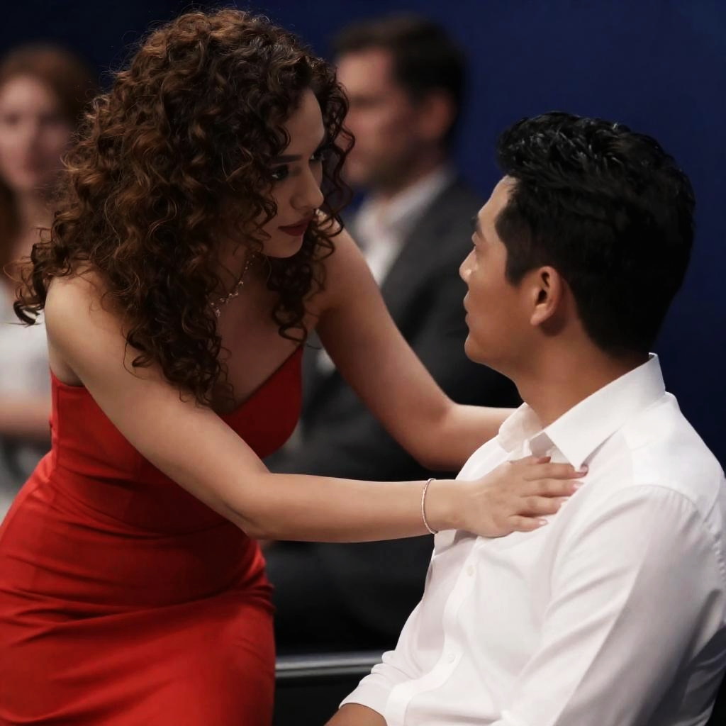 Photograph of a man and woman at night. Man with blond hair in black suit, white shirt, leaning against black SUV. Woman with long dark hair in red ruffled dress, pointing with right arm, standing. SUV on left, woman on right. Both looking at each other. Street and trees in background.