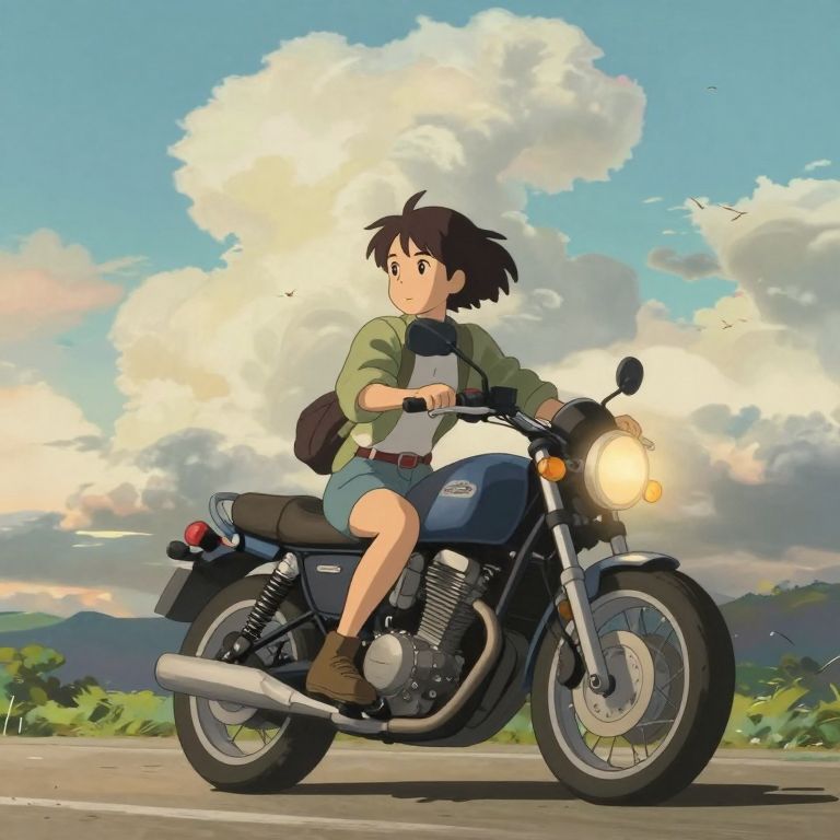In this vector painting, a girl is depicted riding a motorcycle, evoking the styles of Makoto Shinkai, Craig Mullins, and Joe Madureira. The muted color palette, characterized by soft, pastel tones, creates a serene and dreamlike atmosphere. The girl, with her hair tied back, is dressed in a casual jacket and shorts, exuding a sense of freedom and adventure. The motorcycle, with its sleek design and glowing headlight, is positioned centrally, drawing the viewer's attention. The background features a dramatic sky with swirling clouds and a few birds in flight, adding a sense of motion and depth to the scene. The overall composition is balanced, with the girl and motorcycle as the focal points, surrounded by the expansive sky and distant landscape, creating a sense of scale and grandeur. The interplay of colors, textures, and shapes enhances the visual richness, making the image both captivating and evocative.