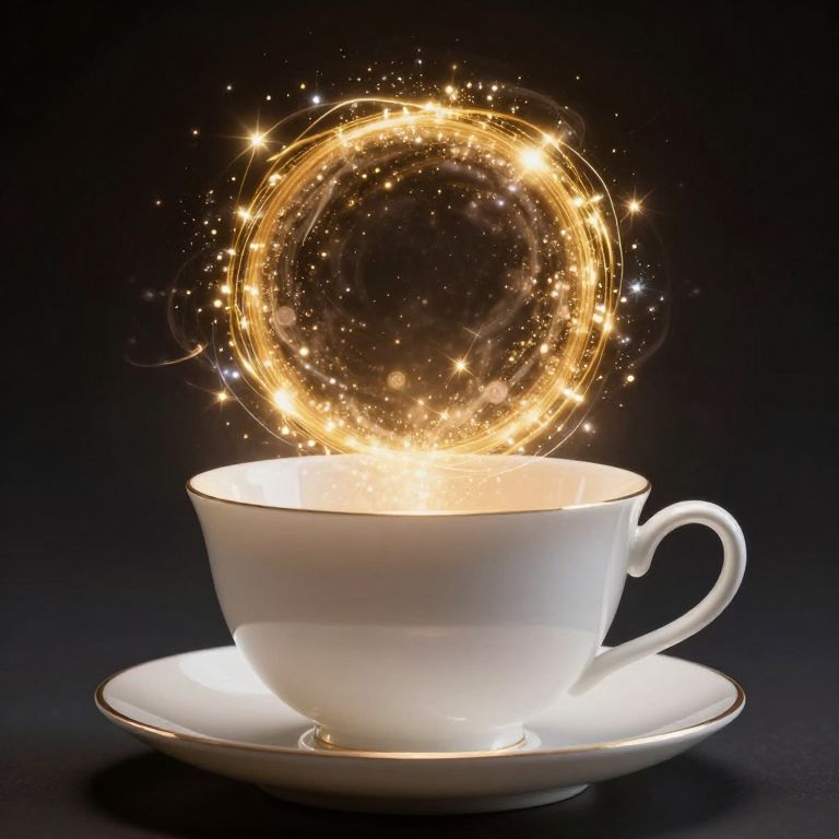 Photograph of a white porcelain cup and saucer set on a black background. The cup, with a simple curved handle, sits on a matching saucer. A glowing, golden, circular orb of light with sparkling stars emanates from the cup, creating a magical effect. The orb is bright, with light reflections and small, white, twinkling stars around it, giving an ethereal, enchanted appearance. The cup's rim and saucer's edge are subtly highlighted with a thin, gold trim, adding a touch of elegance. The overall composition is centered, with the cup and saucer in the bottom half and the magical orb in the top half, creating a balanced, captivating visual.