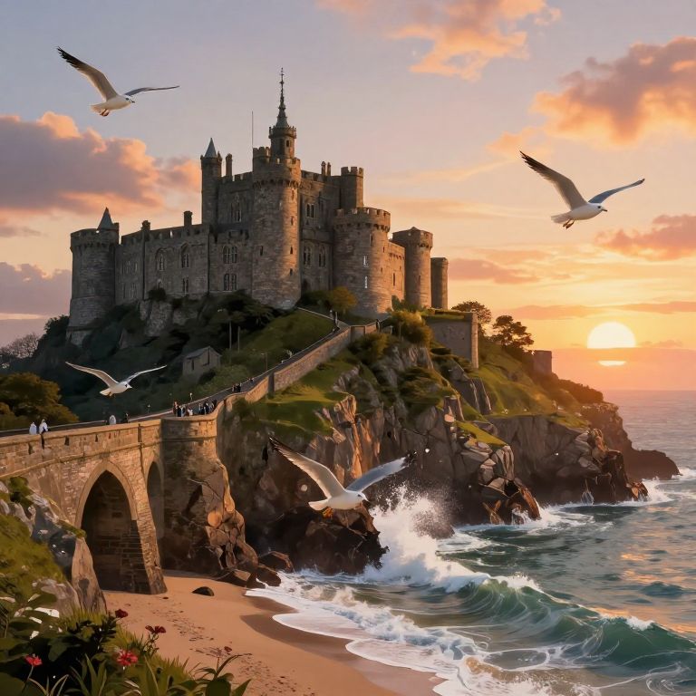 Photorealistic digital painting of a majestic medieval castle perched on a rocky cliff at sunset, with seagulls flying, waves crashing, and a