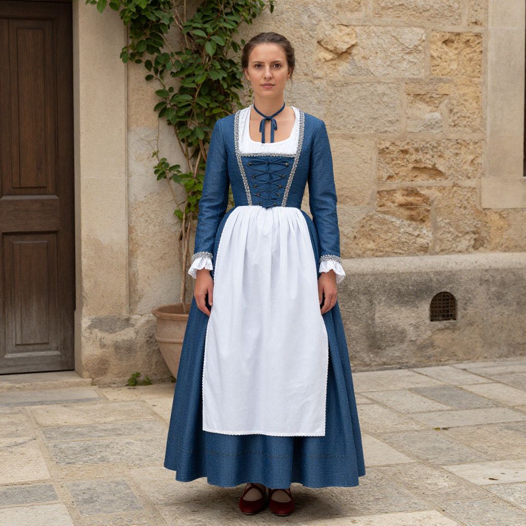 French villager costume, woman in blue and white dress standing in front of a stone building
