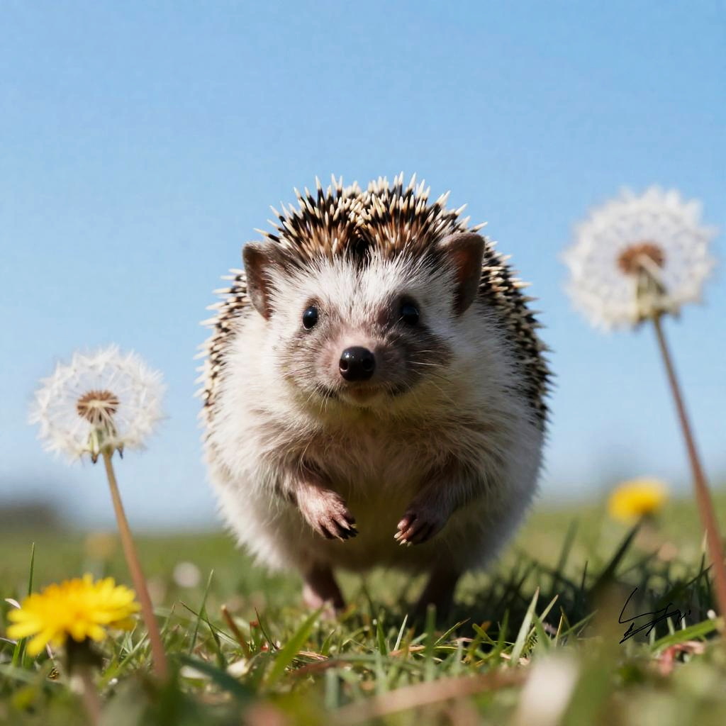 Full body, solo, animal focus, hedgehog, prancing, dandelion, looking at viewer, red eyes, outdoors, blue sky, grass, shadow, day, no humans, signature, artist name