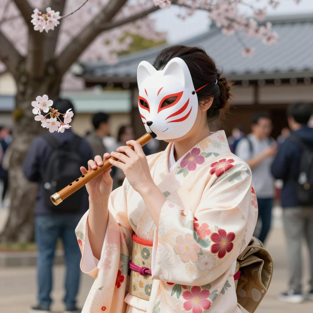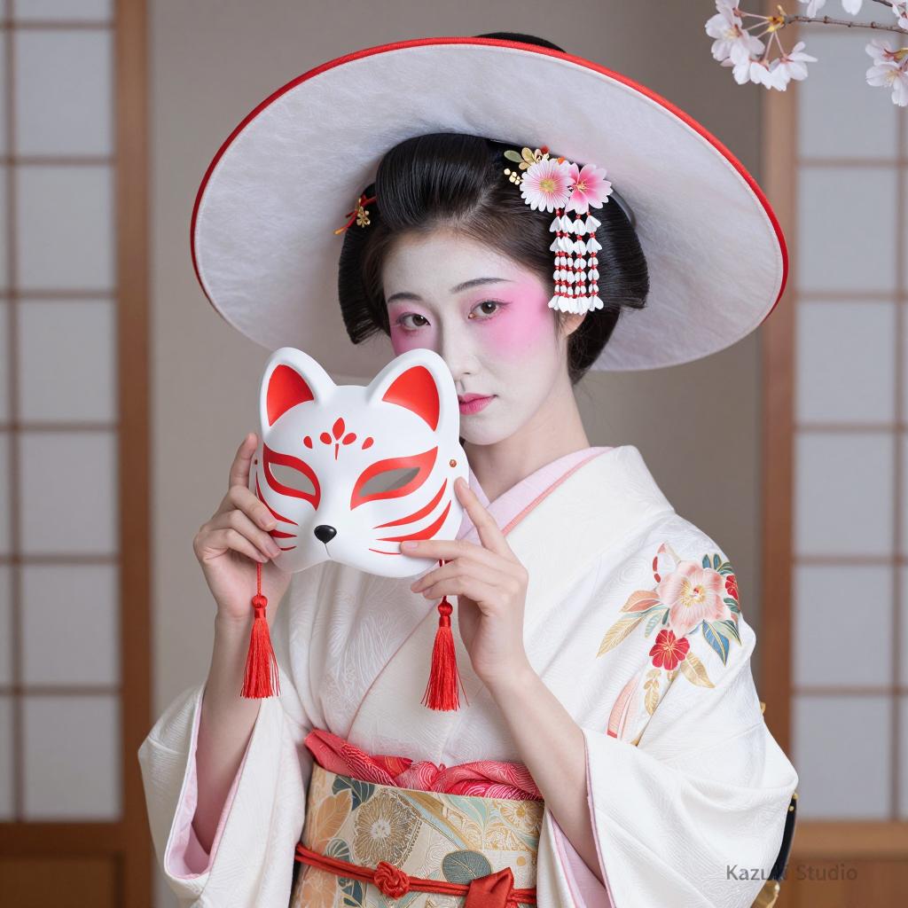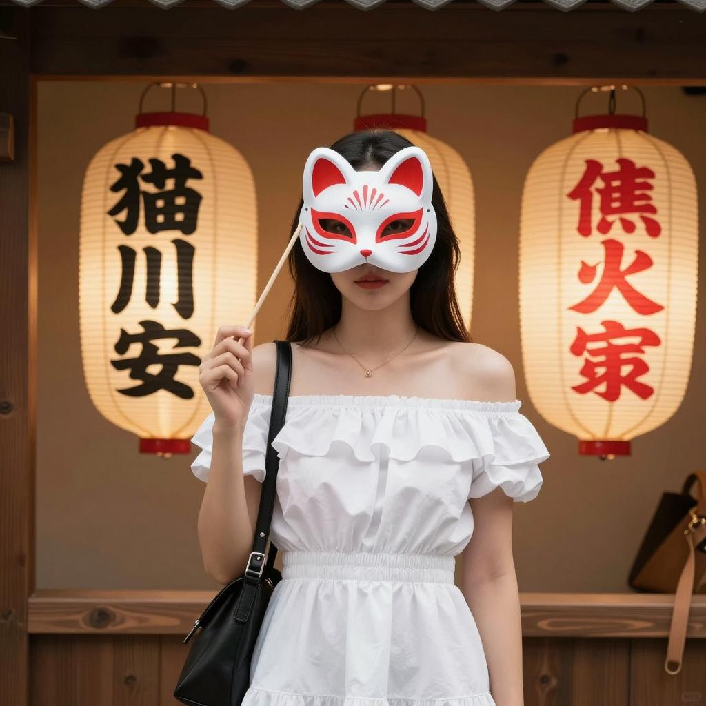 Night street photograph. Japanese woman in center, wearing red and white floral kimono, black hakama with floral pattern, and red fox mask. She stands on a wet sidewalk, holding a black bag. Two other people in background. Neon signs and illuminated shop fronts line the street. Street lights and reflections create a glossy surface. Two-storey buildings with red roofs on both sides. Watermark in bottom right corner.