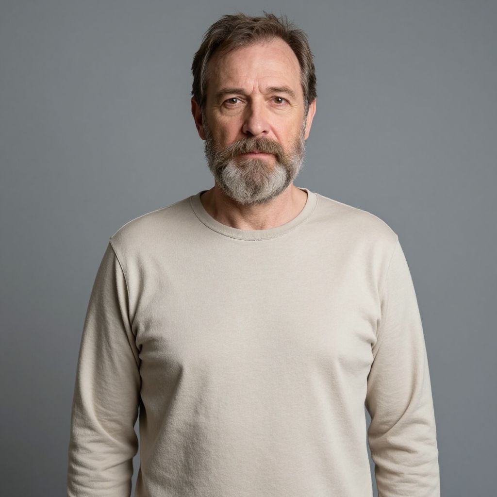 Photograph of a middle-aged white man with a rugged appearance, standing against a solid gray background. He has short, dark gray hair and a full, gray beard. His expression is neutral, with slightly furrowed brows and a subtle smile. He is wearing a plain, long-sleeved, light beige shirt that fits loosely. The lighting is even, highlighting the texture of his beard and the soft fabric of his shirt. The image has a clean, studio-quality look, focusing entirely on the subject from the waist up.