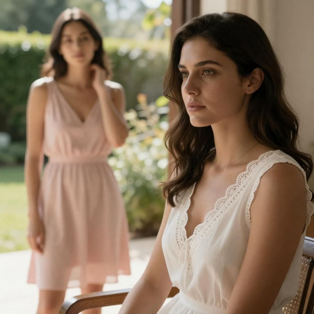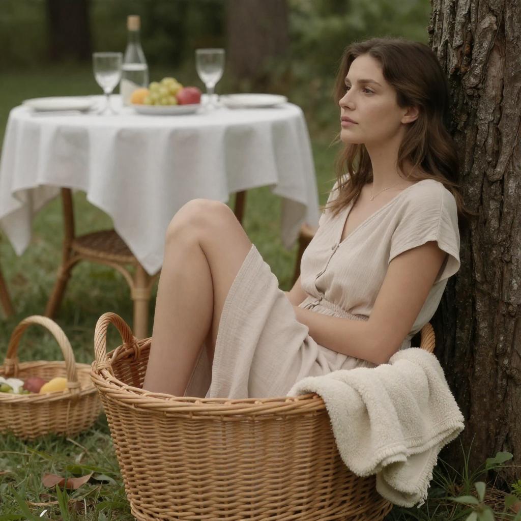 Photograph of a woman with light brown hair, wearing a beige dress, sitting in a wicker basket outdoors. She leans against a tree with a pensive expression. Background includes a wicker table with a white cloth, food, and glassware. Grass and forest in the background. Basket has a beige blanket. Another wicker basket with food is on the left.