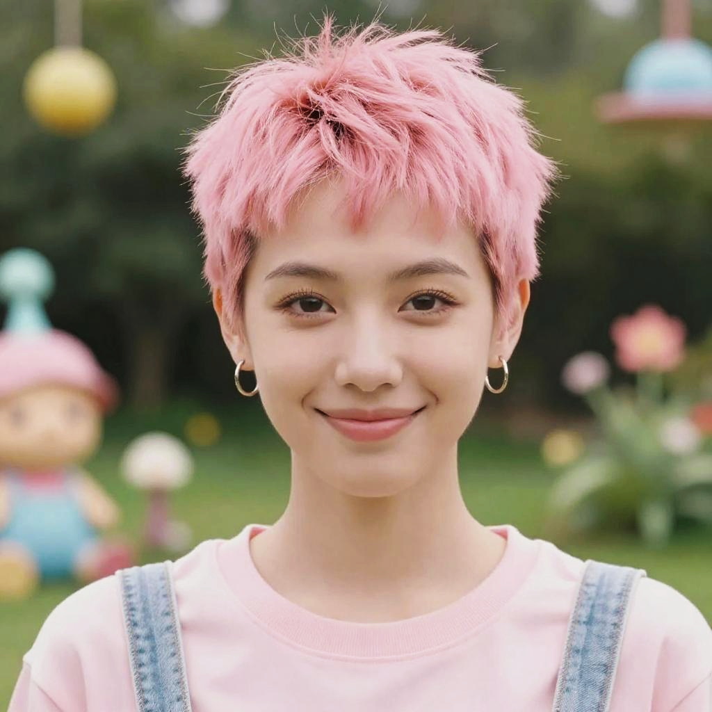 Pixie cut pink hair, vibrant pastel colors, soft lighting, young woman with confident smile, outdoor garden background, whimsical and playful style