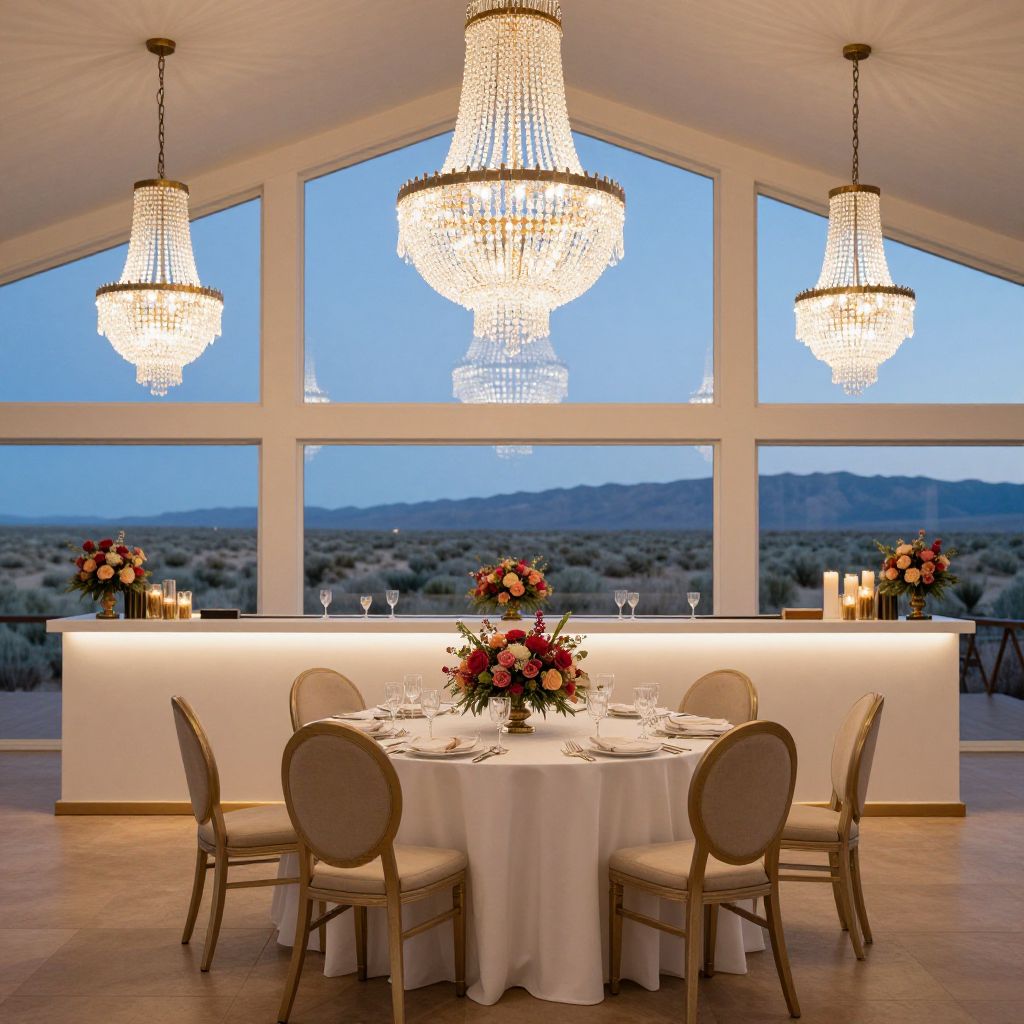 Elegantly lit bar area at a wedding reception featuring a central round table adorned with a vibrant floral centerpiece, surrounded by six chairs, illuminated by cascading crystal chandeliers and framed by expansive windows showcasing a serene desert landscape at dusk.