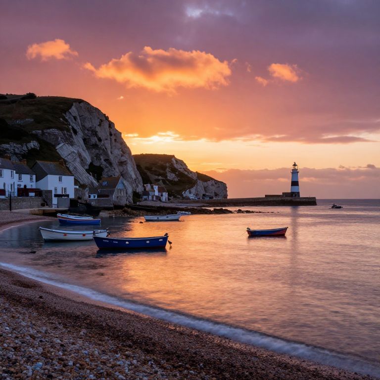 Sussex coastal village at sunset, rugged cliffs overlooking a calm sea, colorful boats docked near a pebble beach, historic lighthouse in the background, sky painted in vivid oranges and purples, gentle waves reflecting warm light, tranquil maritime scene.
