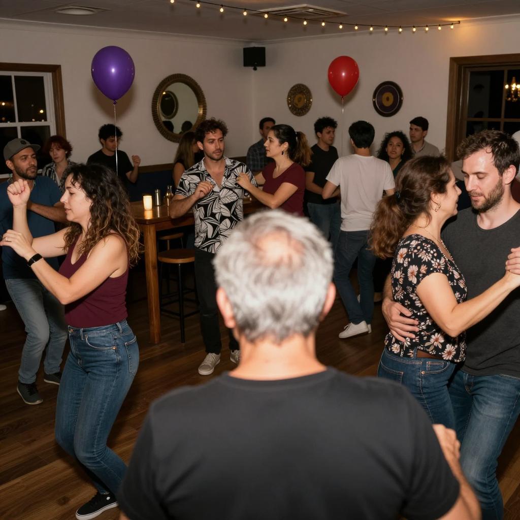 Crowded room, dim lighting, string lights overhead, people dancing, diverse clothing, white-haired person with back to camera in foreground, 17 people, some wearing hats, red and purple balloons, wooden tables, circular wall decorations, intense expressions, indoor setting.
