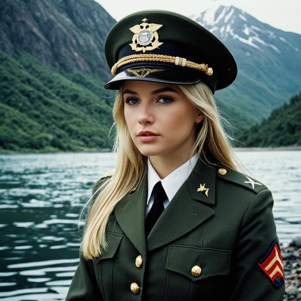 Blonde female boat captain wearing a navy blue military-style uniform with gold buttons and a white captain's hat. She stands confidently on a yacht with ocean and cloudy sky in the background. The uniform includes a belt, epaulettes, and a tie, showcasing a formal maritime appearance.