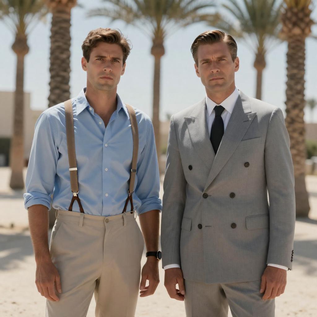 Photograph of two men standing outdoors in a sunlit, desert-like setting with tall, dark palm trees in the background. The man on the left has short brown hair, wears a light blue shirt with rolled sleeves, brown suspenders, and beige pants. The man on the right has slicked-back brown hair, wears a light gray, double-breasted suit with a white shirt and black tie. Both men have serious expressions.