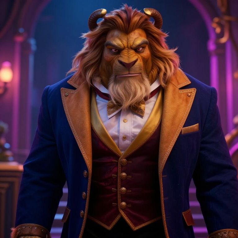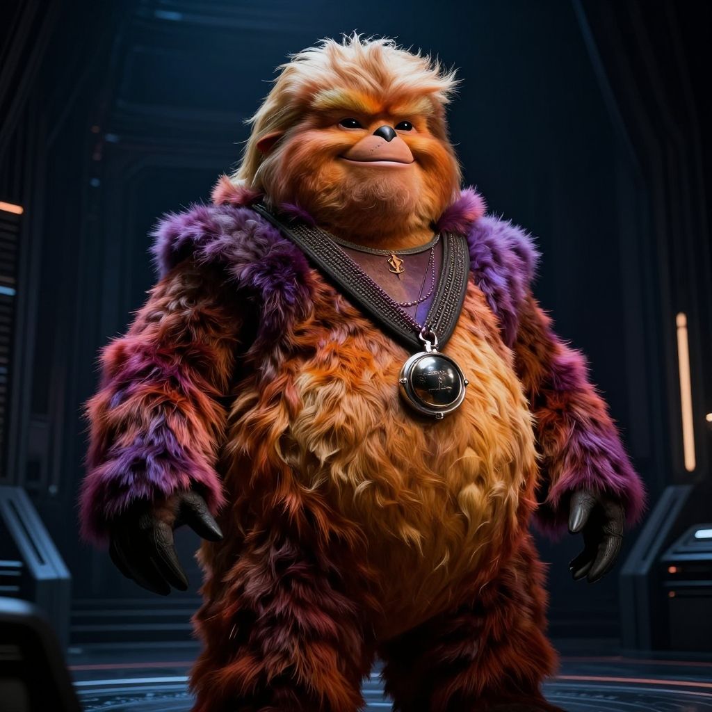 Photograph of a Chewbacca costume from Star Wars. The furry, brown and reddish-brown figure stands in a dimly lit, futuristic room with dark blue and black metallic walls. Chewbacca wears a detailed, purple, leather-like vest adorned with silver embellishments and a circular emblem on the chest. His long, shaggy fur covers his entire body, and he has large, black, clawed hands. The background features illuminated steps and metallic structures. The image is highly detailed with a realistic, CGI-like quality, emphasizing the texture of the fur and costume.