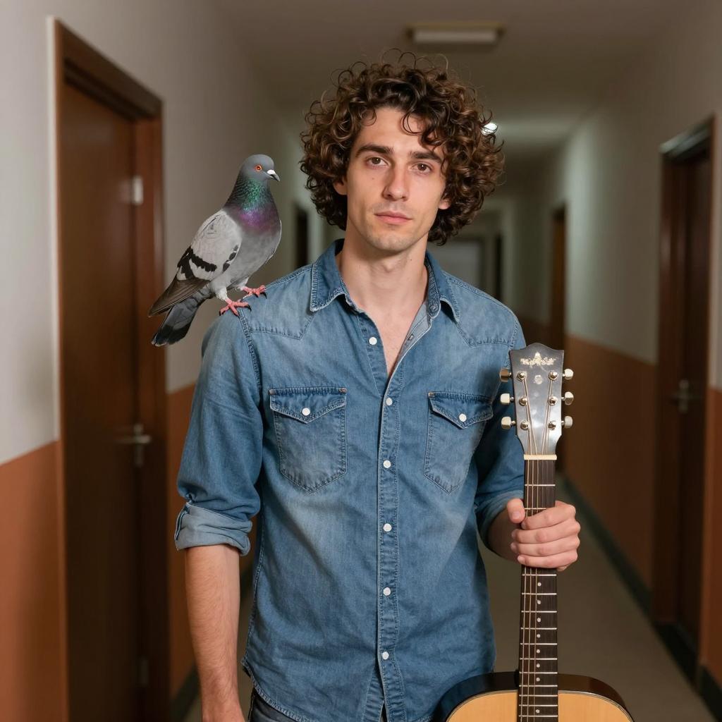 Three men stand outdoors in a foggy setting. Central man with curly dark hair, wearing a light gray hoodie and pants, holds a gold trumpet. Two older men in dark suits and ties face him, standing on the left and right. Central man's expression is neutral, older men's expressions are not visible.