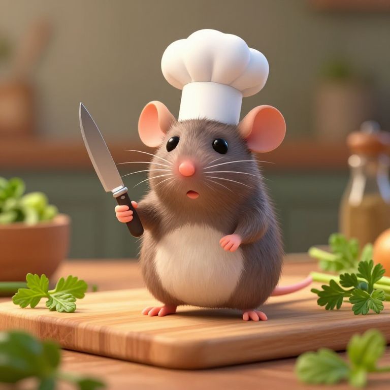 Rat Remy holding a tiny chef’s knife, standing confidently on a cutting board, surrounded by fresh herbs and ingredients, soft ambient lighting, detailed and charming cartoon style