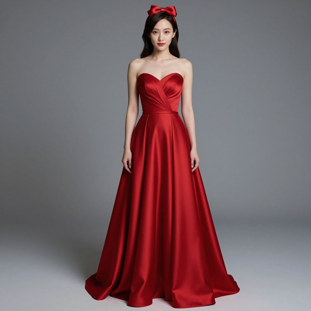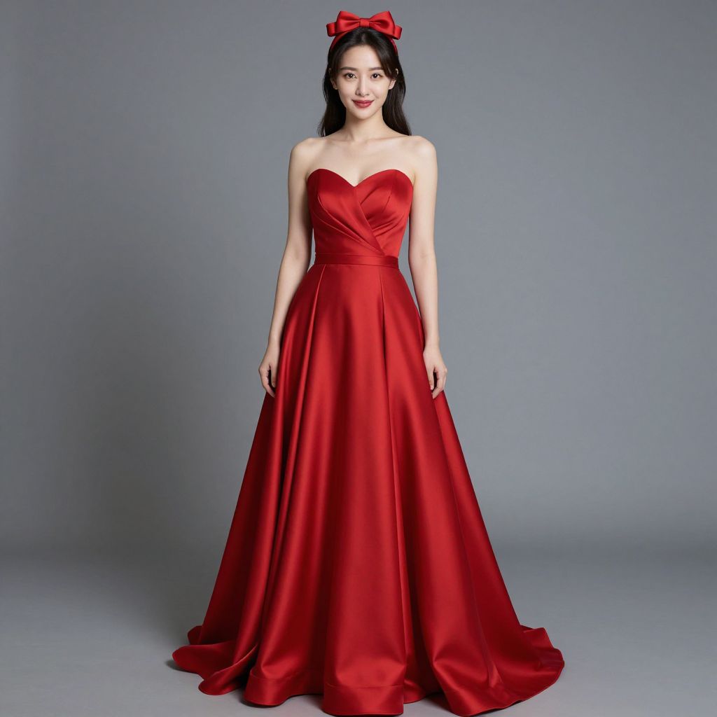 Elegant woman wearing a vibrant red satin gown with a sweetheart neckline and flowing skirt, complemented by a matching red bow headband, poised against a neutral gray backdrop.