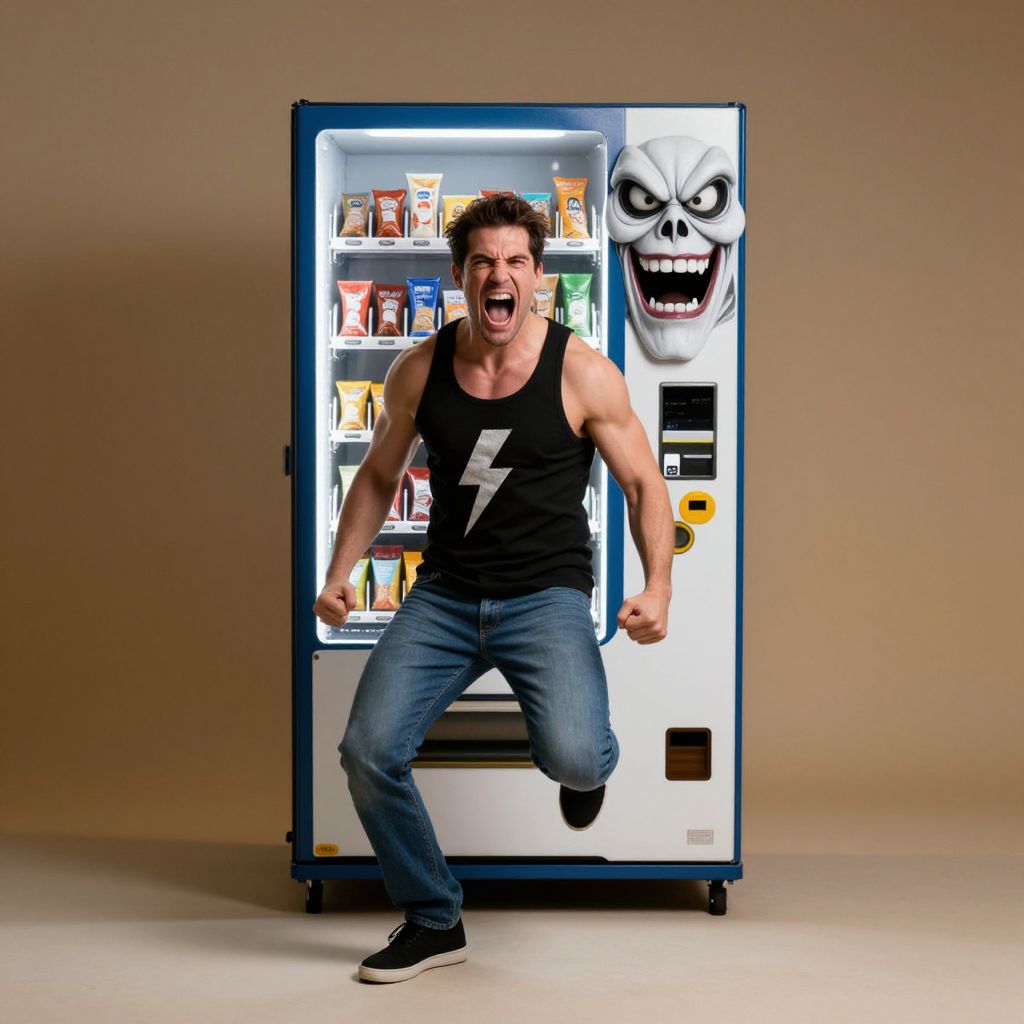 In this dynamic full-body shot, a muscular man with a fierce expression is captured in a moment of intense emotion, his mouth wide open in a scream. He is wearing a black tank top with a lightning bolt design and blue jeans, exuding an aura of raw power and determination. His right leg is bent at the knee, and his left leg is extended, creating a sense of movement and aggression. The man is positioned in front of a large vending machine, which is open and filled with various snacks. The vending machine, painted with a menacing face, adds to the dramatic effect, as if it's a character in its own right. The lighting is natural, casting soft shadows that enhance the three-dimensional quality of the scene, while the background is a gradient of warm tones, focusing attention on the central figures. The overall composition is balanced, with the man and the vending machine as the focal points, creating a powerful and engaging visual narrative.
