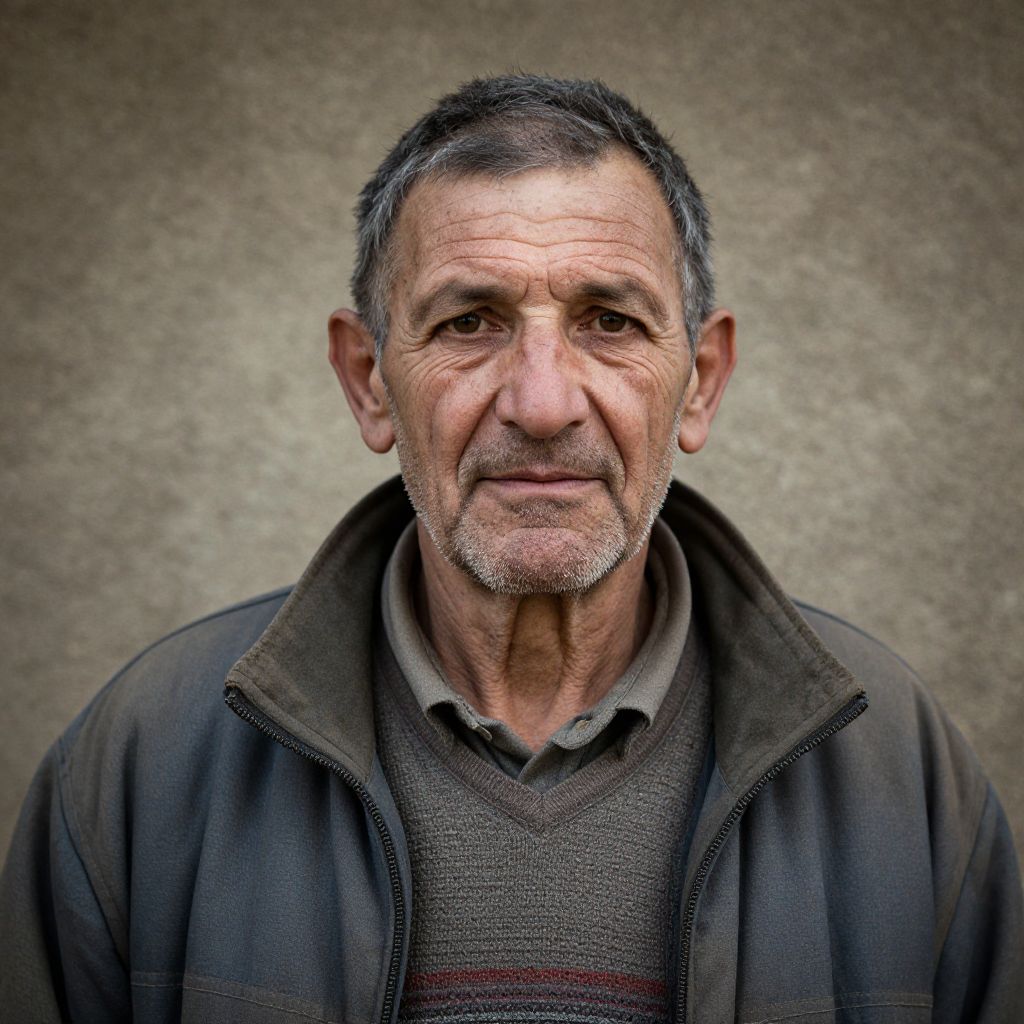 Portrait of an elderly man with weathered features, wearing a rugged jacket, set against a textured background.