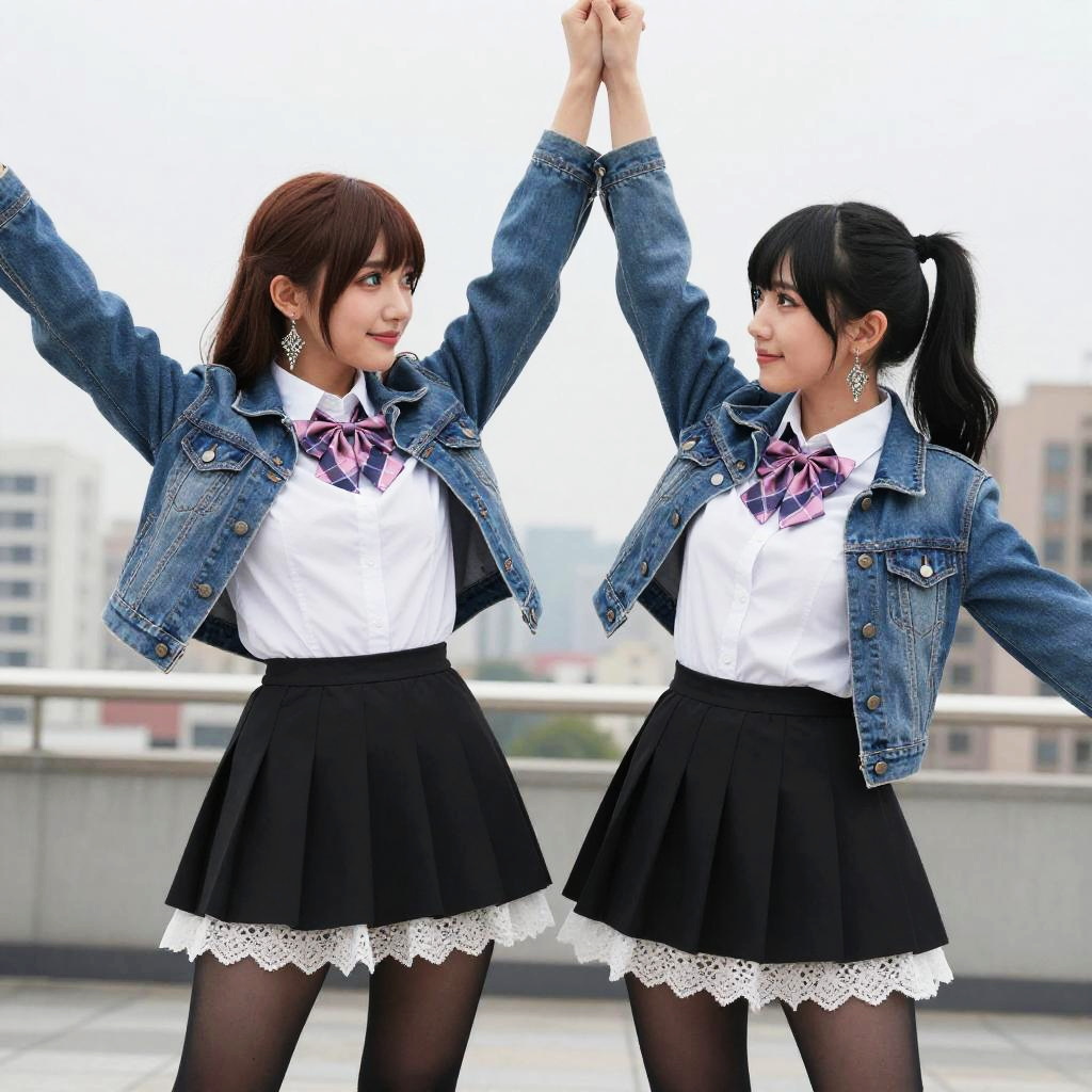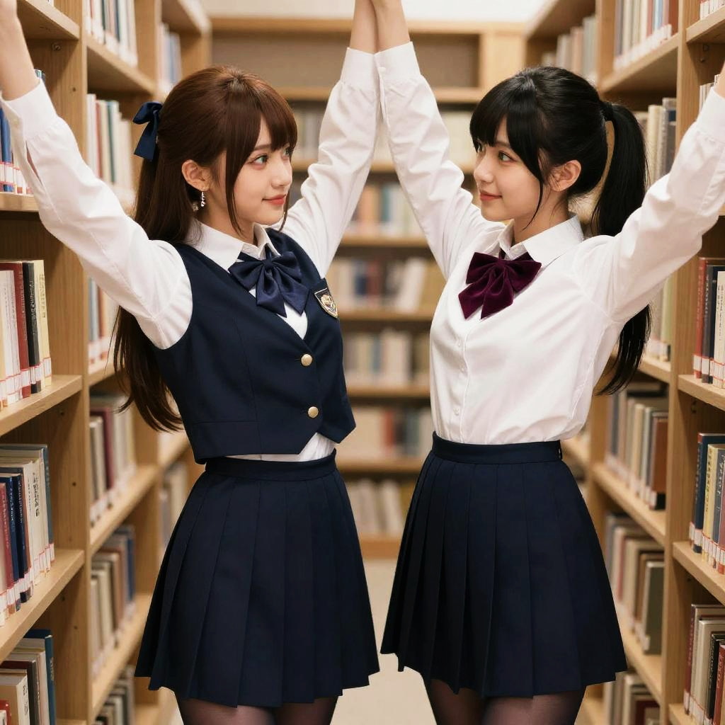 2girls, multiple girls, school uniform, plaid skirt, pantyhose, beige pantyhose, jacket, blue jacket, shirt, white shirt, collared shirt, long sleeves, looking at another, arms up, smile, closed mouth, green eyes, red eyes, brown hair, long hair, black hair, ponytail, parted bangs, breasts, medium breasts, earrings, jewelry, ribbon, lace_bow, bowtie, hair ribbon, plaid, official alternate costume, classroom background