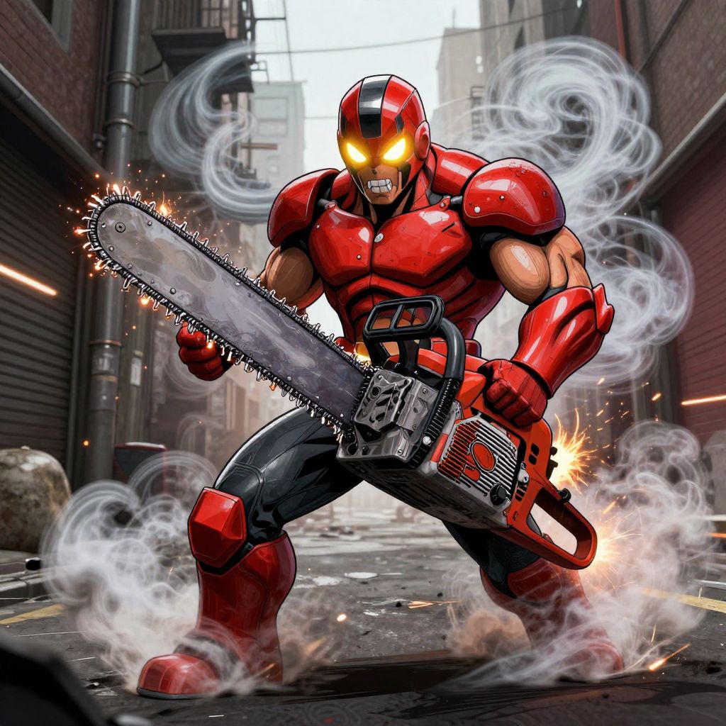 Digital artwork of a muscular, red and black armored superhero with glowing eyes, wielding a chainsaw, surrounded by smoke, in an urban alley.