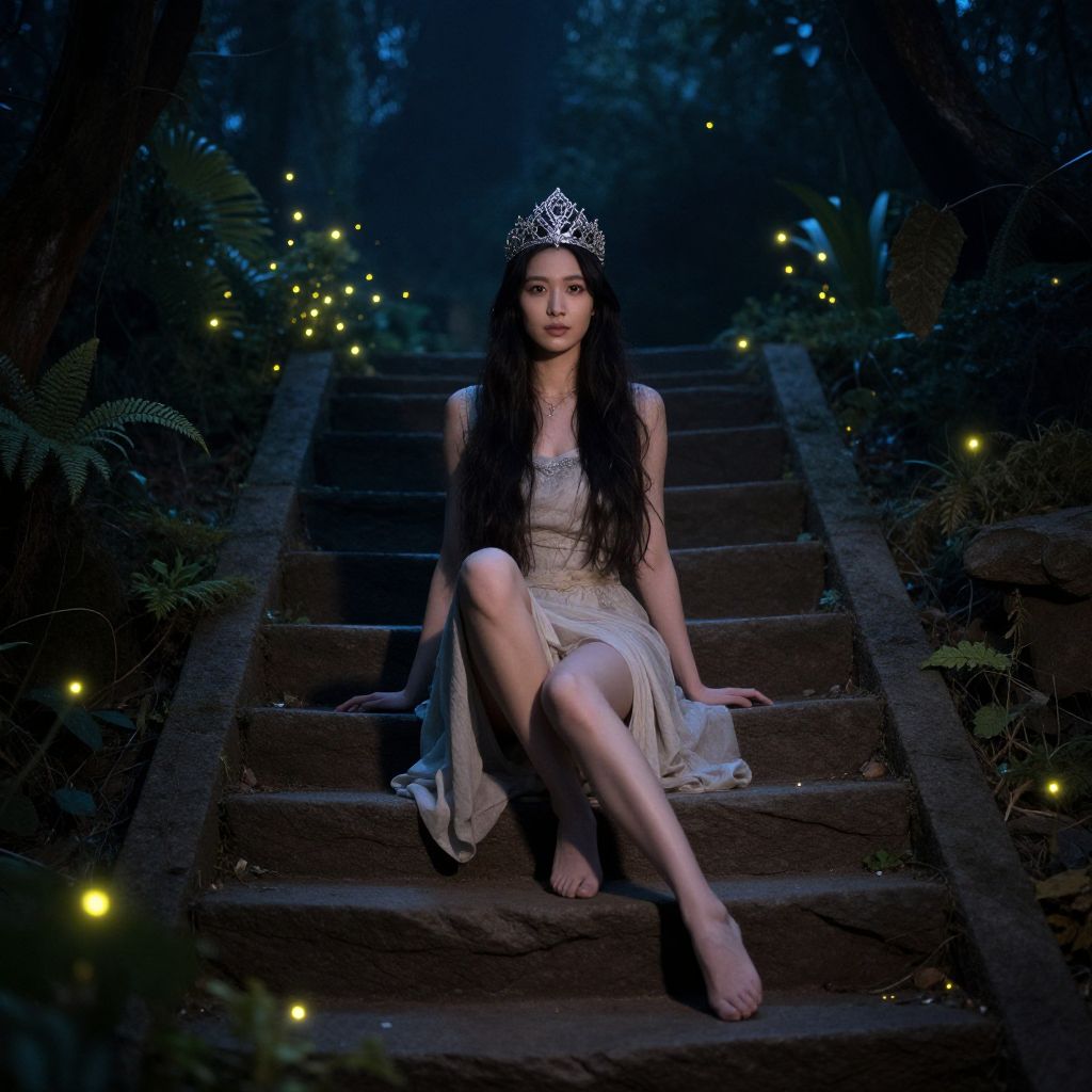 Super beautiful woman sitting gracefully on ancient stone steps in a mystical forest, surrounded by glowing fireflies and magical plants, wearing a delicate silver tiara and robes, enchanting atmosphere with dreamlike lighting