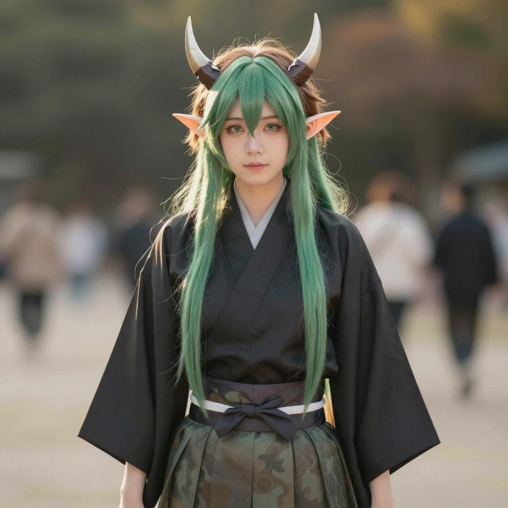 Photo-realistic cosplay photo of person standing in moroboshi ataru costume. oni, oni horns, pointy ears, horns, long hair, green hair, brown hair, gakuranfull body shot. lifestyle stock photo, shallow depth of field, lifestyle stock photography, shallow depth of field, natural lighting, warm tones, soft background blur, vibrant colors, realistic textures