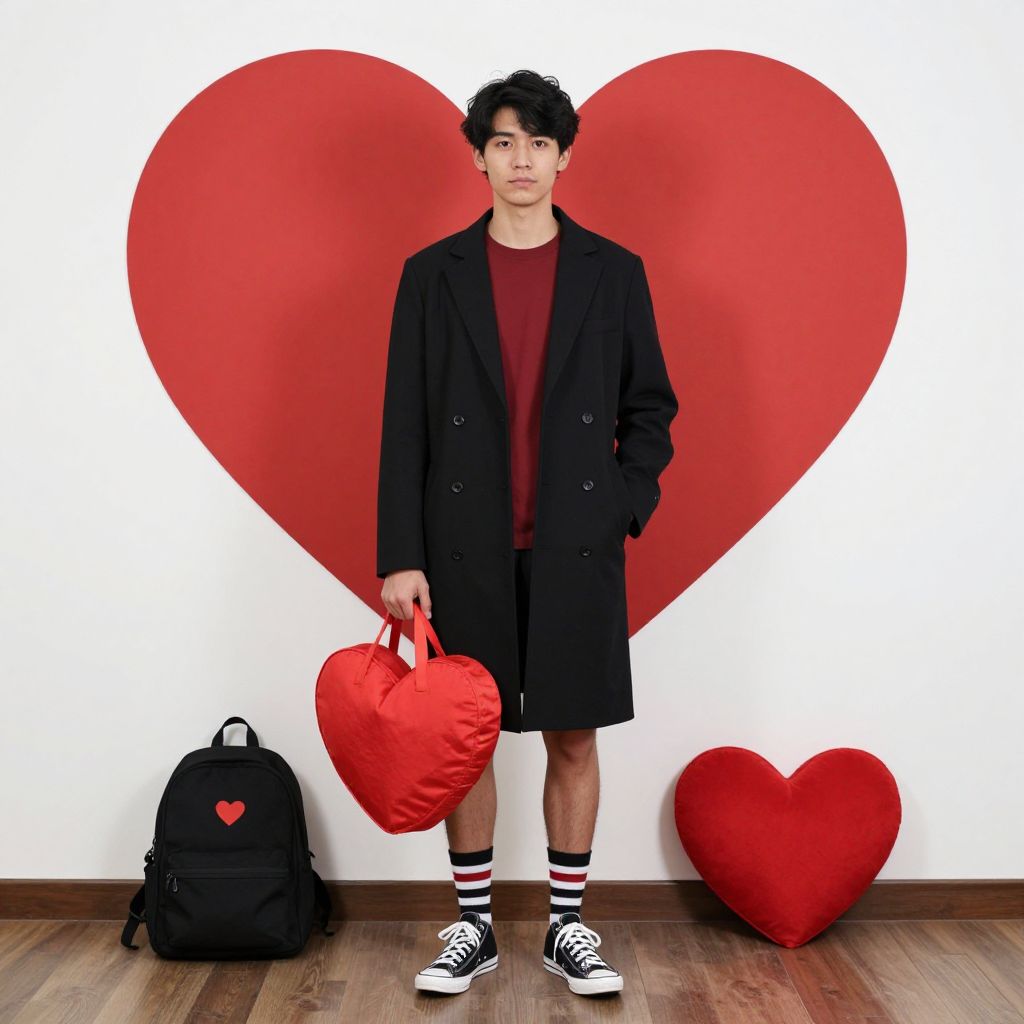 Photograph of an Asian male with short black hair, standing against a white wall with a large red heart backdrop. He wears a long black overcoat, red t-shirt, black knee-length shorts, white and black striped socks, and black and white sneakers. He holds a red heart-shaped pillow in his right hand and has a black backpack with a red heart logo on the floor to his left. A second red heart pillow is on the floor to his right. The floor is wooden. The image has a modern, minimalist style.